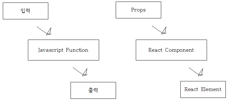 - 자바스크립트 함수가 입력을 받은 후 출력하는 것처럼, React Component의 입력은 Props이고, 출력은 React Element이라고 볼 수 있다.