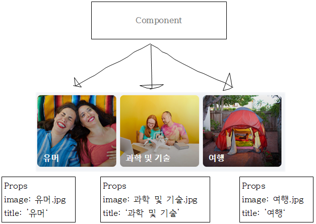 - image와 title이 적혀있는 Props들이 Component를 통해 각각의 '유머', '과학 및 기술', '여행'이라는 element가 나왔다.